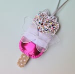 Made from printed cotton fabric bonded to felt, faux leather and glitter fabric, each lolly is hand-sewn with embroidery thread. The filling is 100% polyester.
